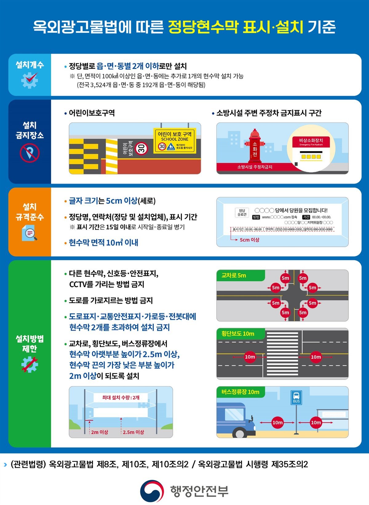 현행 옥외광고물법에 따르면 정당 현수막은 신고 없이 읍·면·동별 2개까지 15일 동안 자유롭게 설치할 수 있으나, 어린이보호구역과 소방시설 주변은 설치를 엄격히 금지한다.