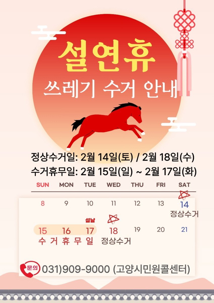 이달 14일과 18일을 집중 수거일로 지정해 생활폐기물과 음식물 관련 폐기물을 정상 수거하고 설 연휴 기간인 2월 15일부터 17일까지는 수거를 중단한다.