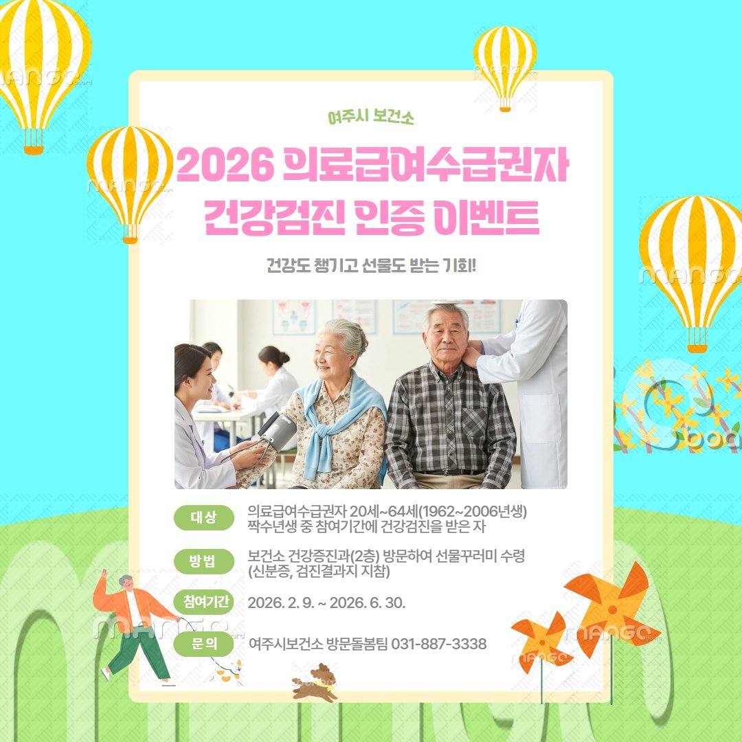 [금요저널] 여주시보건소 건강증진과는 의료급여수급권자의 건강을 지키고 심뇌혈관질환을 예방하기 위해 2026년 6월 30일까지 건강검진을 완료한 분들을 대상으로 '건강꾸러미 제공 이벤트'를 진행한다.