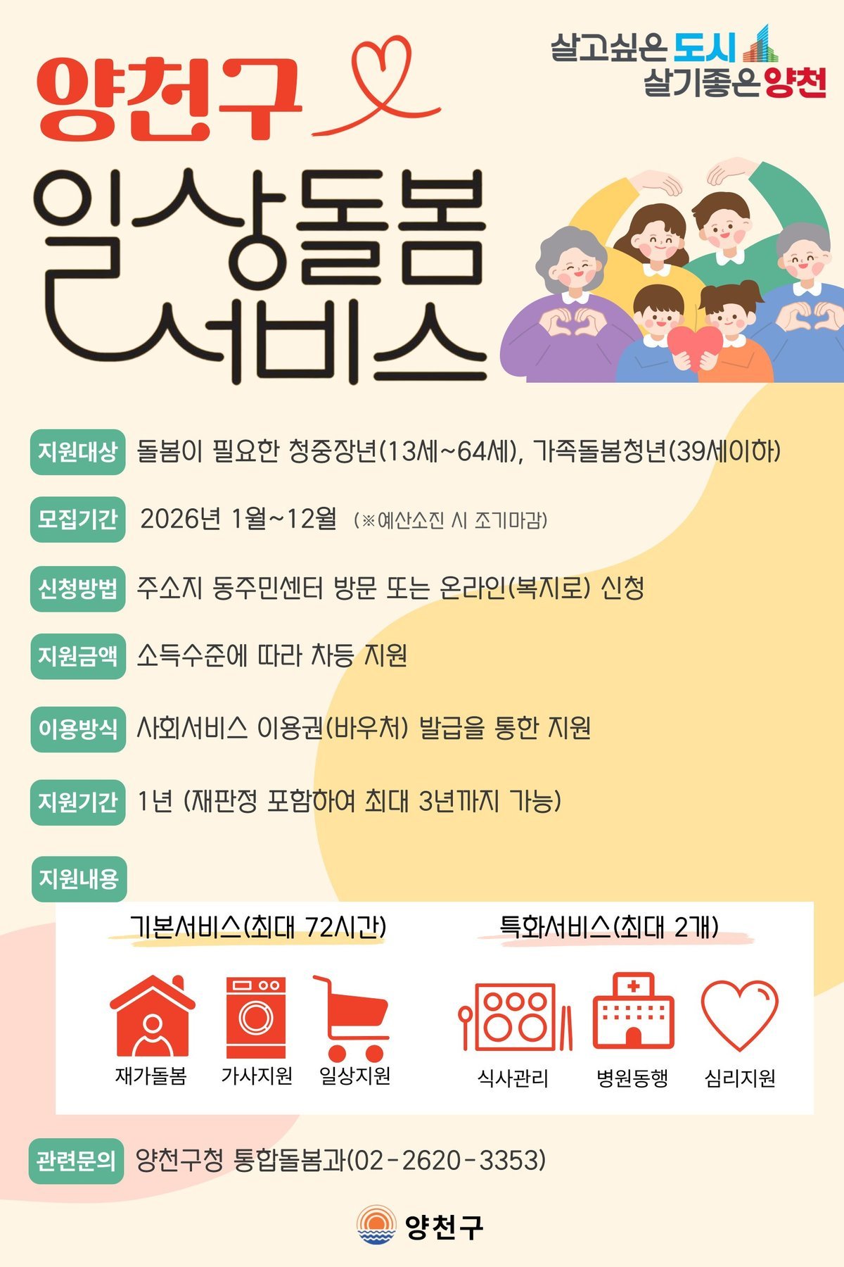 이용을 원하는 구민은 거주지 동 주민센터를 방문해 신청하면 되고 자세한 사항은 양천구청 통합돌봄과로 문의하면 된다.
