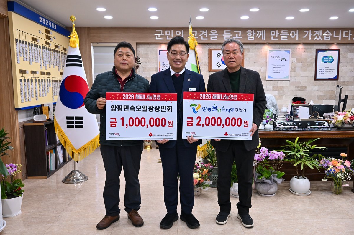 이에 전진선 양평군수는 “지역사회를 위해 따뜻한 나눔을 실천해 주신 양평물맑은시장상인회와 양평민속오일장상인회에 깊이 감사드린다”며 “상생과 나눔의 가치를 바탕으로 더욱 따뜻한 양평을 만드는 데 최선을 다하겠다”고 말했다.
