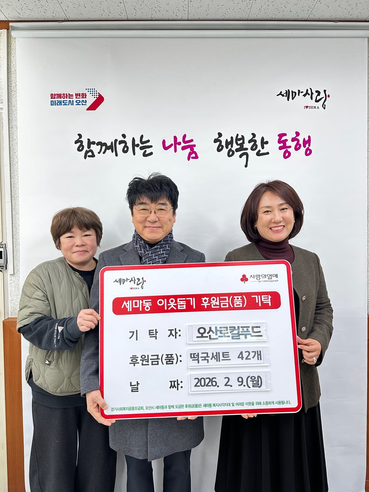 [금요저널] 오산시 세마동 행정복지센터는 지난 9일 오산로컬푸드로부터 관내 복지사각지대 가정을 지원하기 위한 떡국 세트 42개를 기탁받았다고 밝혔다.