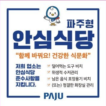 [금요저널] 파주시는 외식에 대한 소비자 신뢰도를 높이고 외식산업 경쟁력 강화를 위해 식품접객업소를 대상으로 2월부터 안심식당 참여업소를 모집한다.