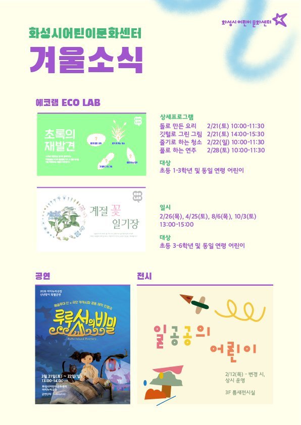 [금요저널] 〇 어린이 맞춤형 생태교육과 문화예술 프로그램 운영 화성시어린이문화센터는 새해를 맞아 지역 생태환경을 주제로 한 특별 교육 프로그램‘에코랩’을 운영한다고 9일 밝혔다.
