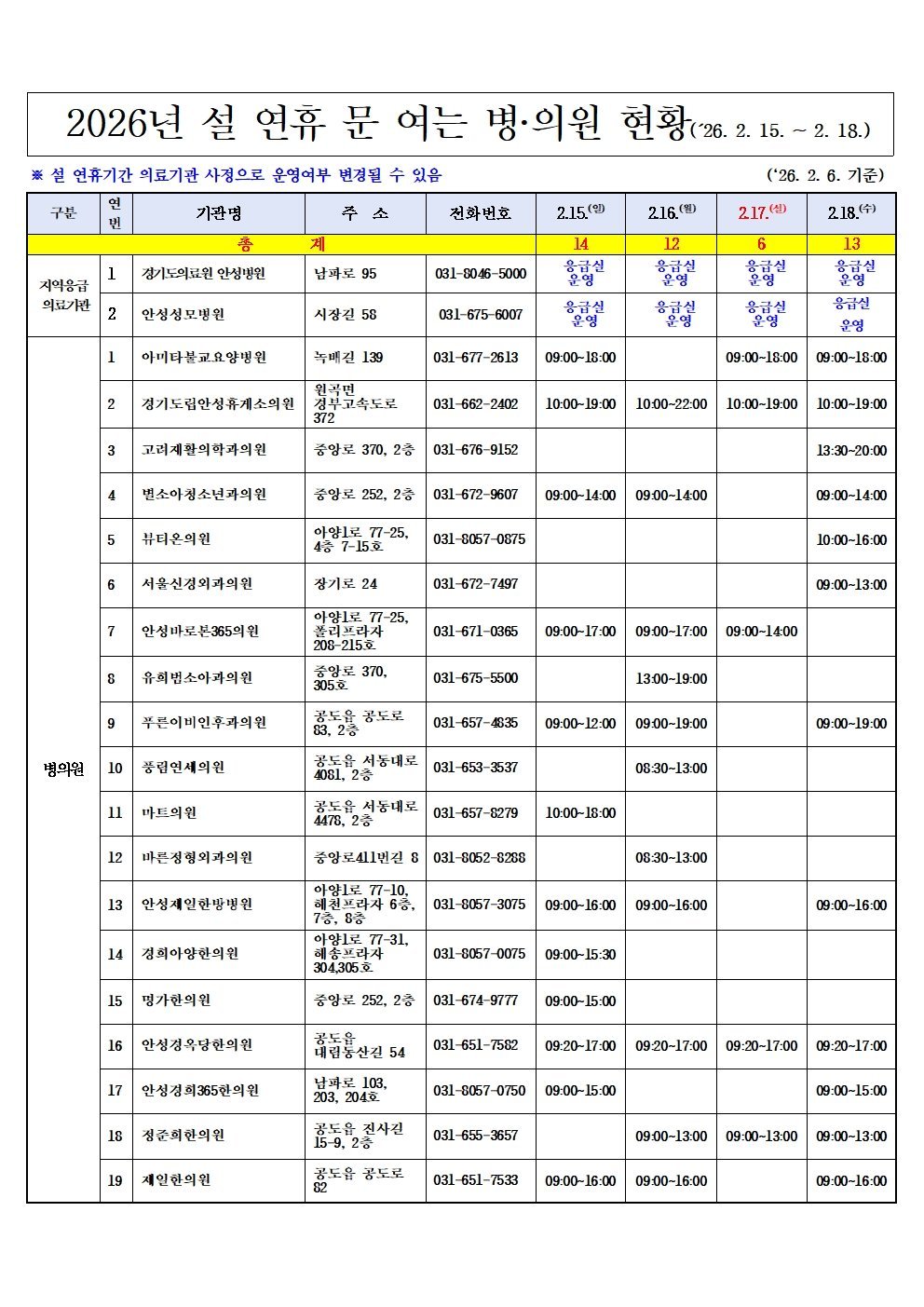 설 연휴 문 여는 병·의원 및 약국 정보는 공동주택 게시판, 또는 보건복지부 콜센터, 구급상황관리센터, 경기도 콜센터를 통해 확인할 수 있다. 온라인에서는 응급의료포털, 스마트폰 앱 ‘응급똑똑’, 안성시청 및 보건소 누리집에서도 확인 가능하다.
