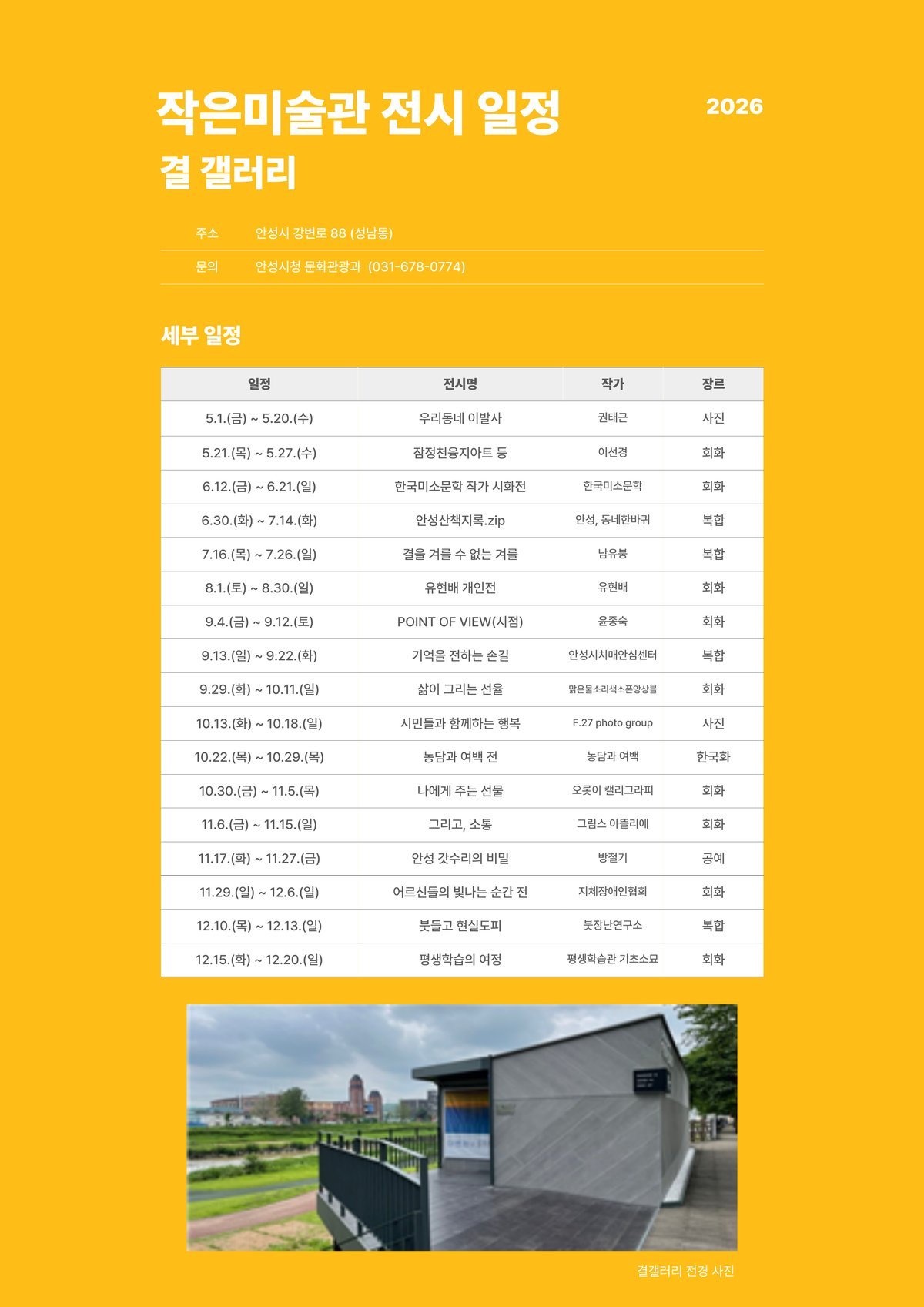 [금요저널] 안성시는 2월 9일 ‘안성시 작은미술관 전시 공모’ 심사 결과를 발표하고, 총 31개의 전시를 최종 선정했다고 밝혔다.