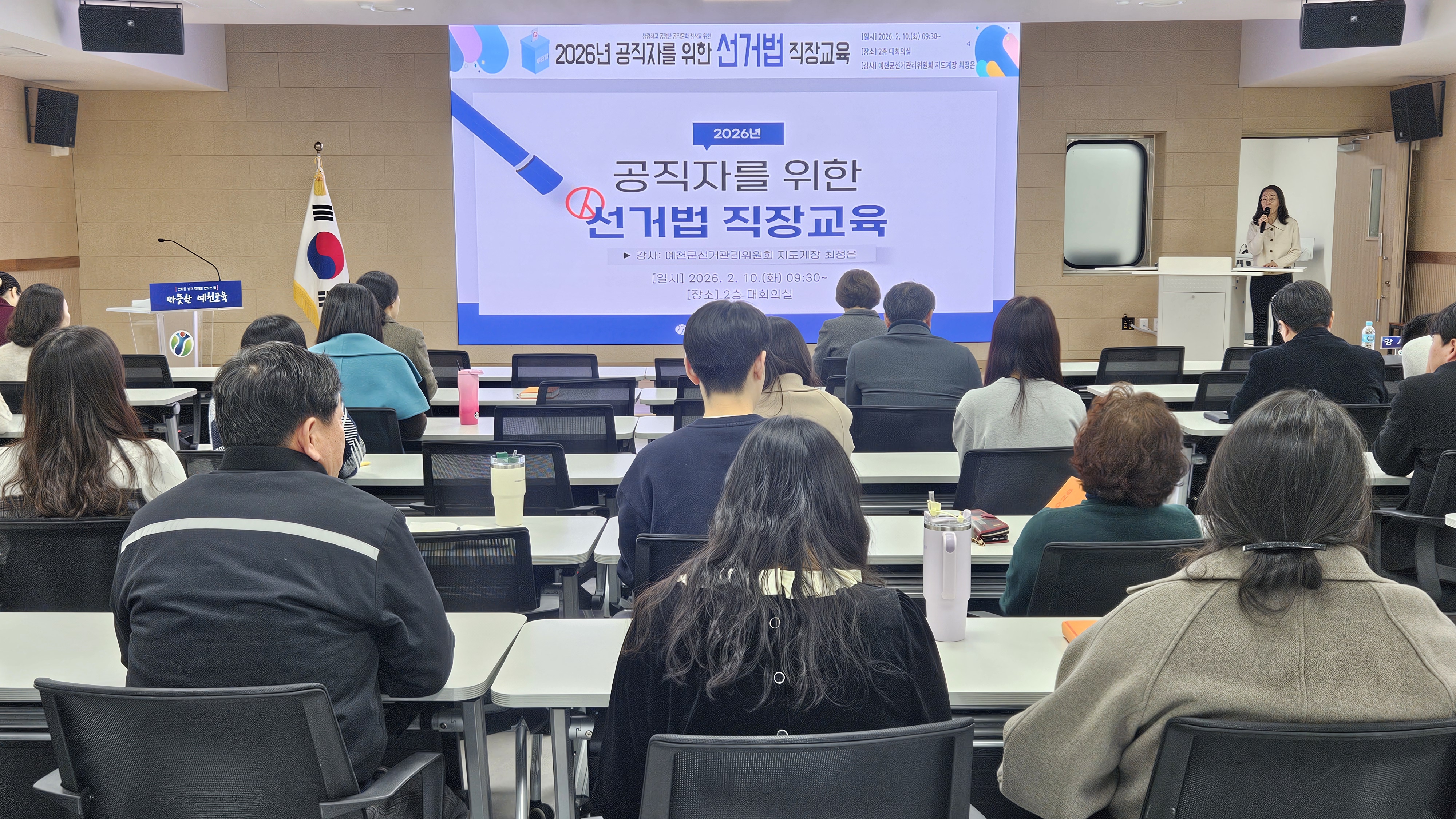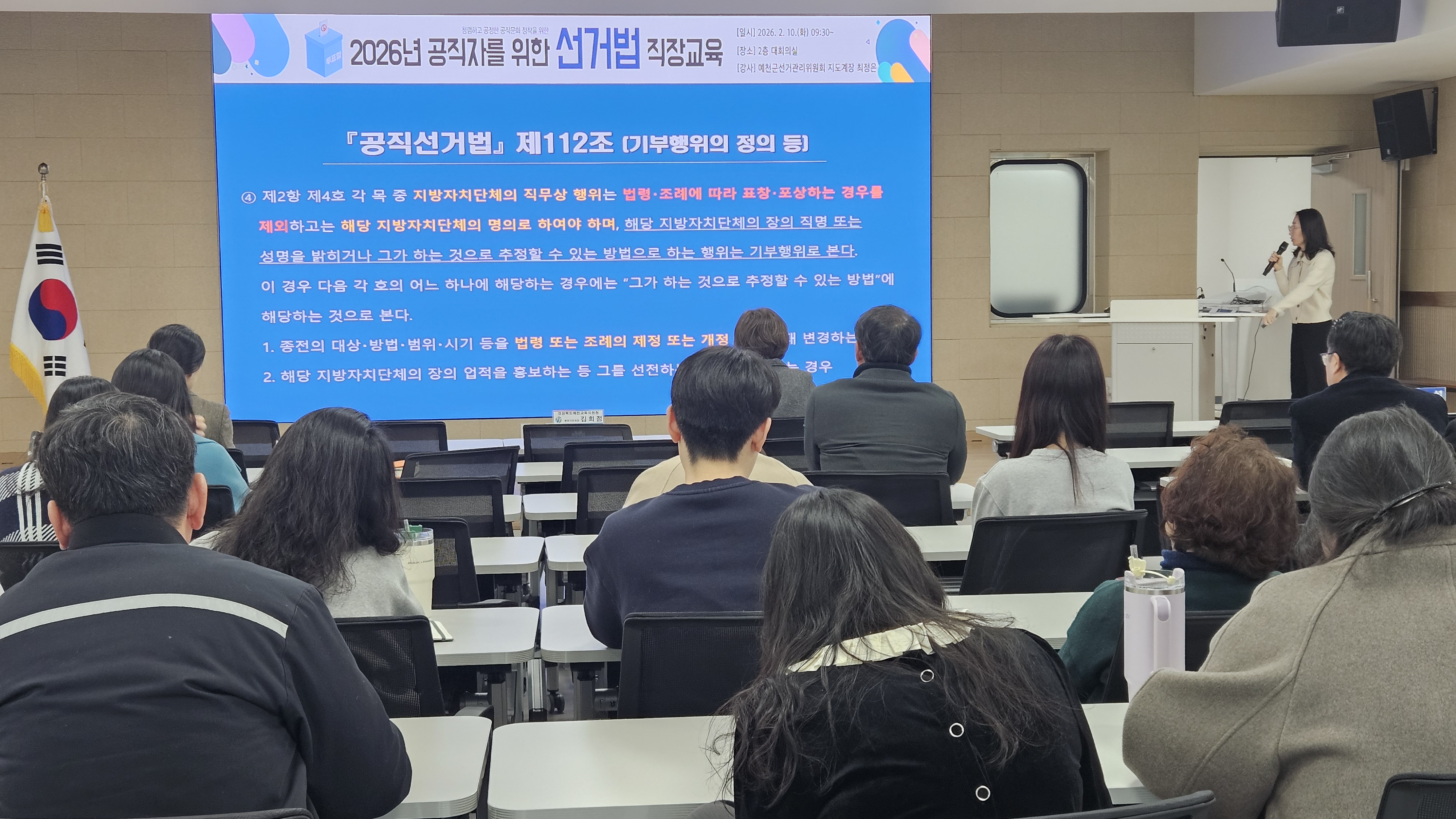 경상북도예천교육지원청(교육장 김성중)은 2월 10일(화) 2층 대회의실에서 교육지원청 및 예천도서관 직원 60여 명을 대상으로 ‘2026년 공직자를 위한 선거법 직장교육’을 실시했다.