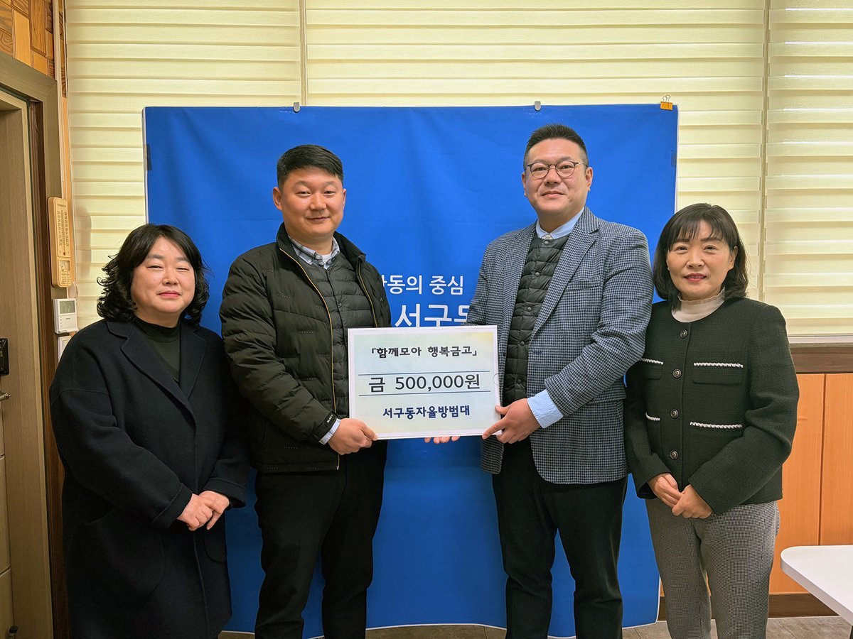 박춘자 서구동장은 “항상 지역을 위해 애써 주시는 자율방범대에 감사드리고 기탁하신 성금이 소중하게 쓰이도록 하겠다”고 전했다.