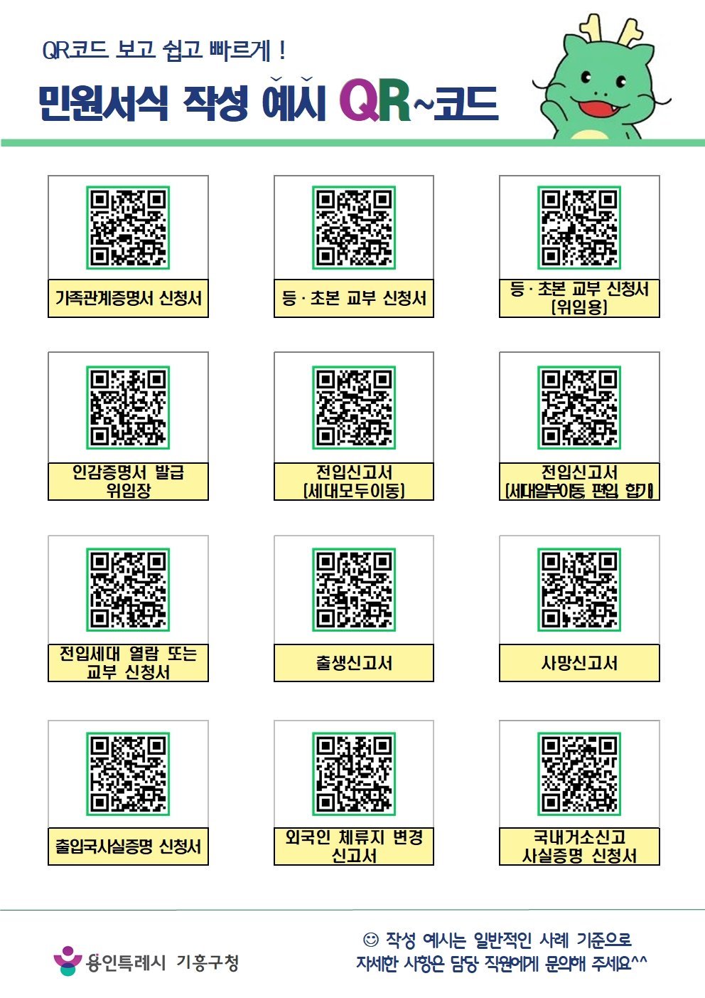 [금요저널] 용인특례시 기흥구는 시민들이 각종 민원 서식을 작성하는 데 도움을 받을 수 있도록 QR코드를 활용한 민원 서식 작성 예시를 제공한다고 11일 밝혔다.
