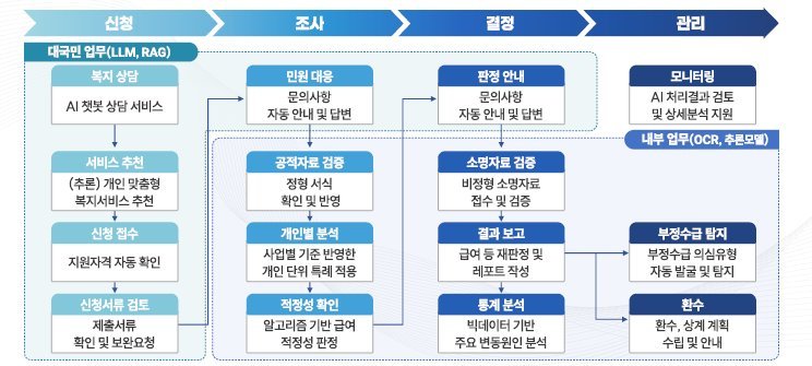 복지행정 AI를 활용하여 국민은 사회보장급여를 편리하게 신청하고 안내받을 수 있으며, 공무원은 반복적인 행정업무 부담을 덜고 현장방문·사례관리 등 본연의 업무에 집중함으로서 촘촘하고 탄탄한 사회안전망을 구축할 예정이다.