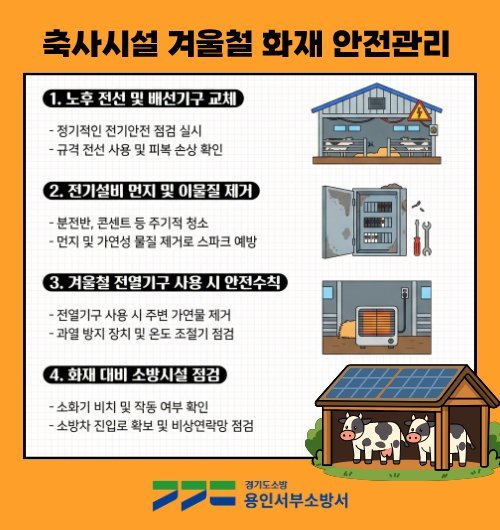 [금요저널] 용인서부소방서는 겨울철 기온 급강하와 건조한 날씨로 화재 위험이 높아진 축사시설을 대상으로 '집중 안전관리'를 추진한다고 11일 밝혔다.