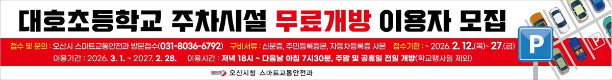 [금요저널] 오산시는 오는 2월 12일부터 27일까지 ‘대호초등학교 주차시설 무료개방’사업의 2년 차 이용자를 모집한다고 밝혔다.