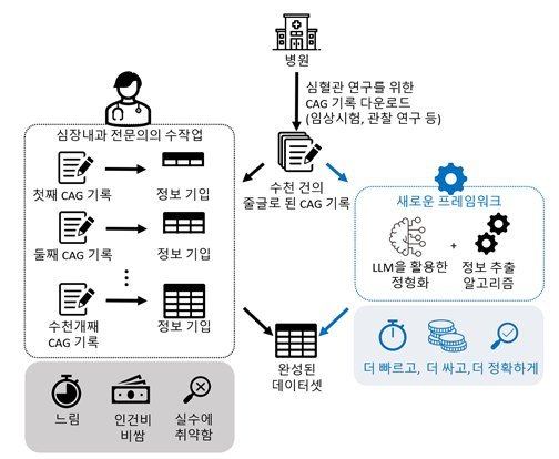 관상동맥조영술 보고서는 심혈관질환 진단과 치료에 핵심적인 정보를 담고 있지만, 대부분 비정형적인 서술 방식으로 작성되어 대규모 연구나 정책 분석에 활용하기 여려웠다. 기존 방식의 경우 심장내과 전문의가 수천 건의 관상동맥조영술 기록을 직접 읽고 필요한 정보를 수작업으로 정리해야하는 한계가 있었다.