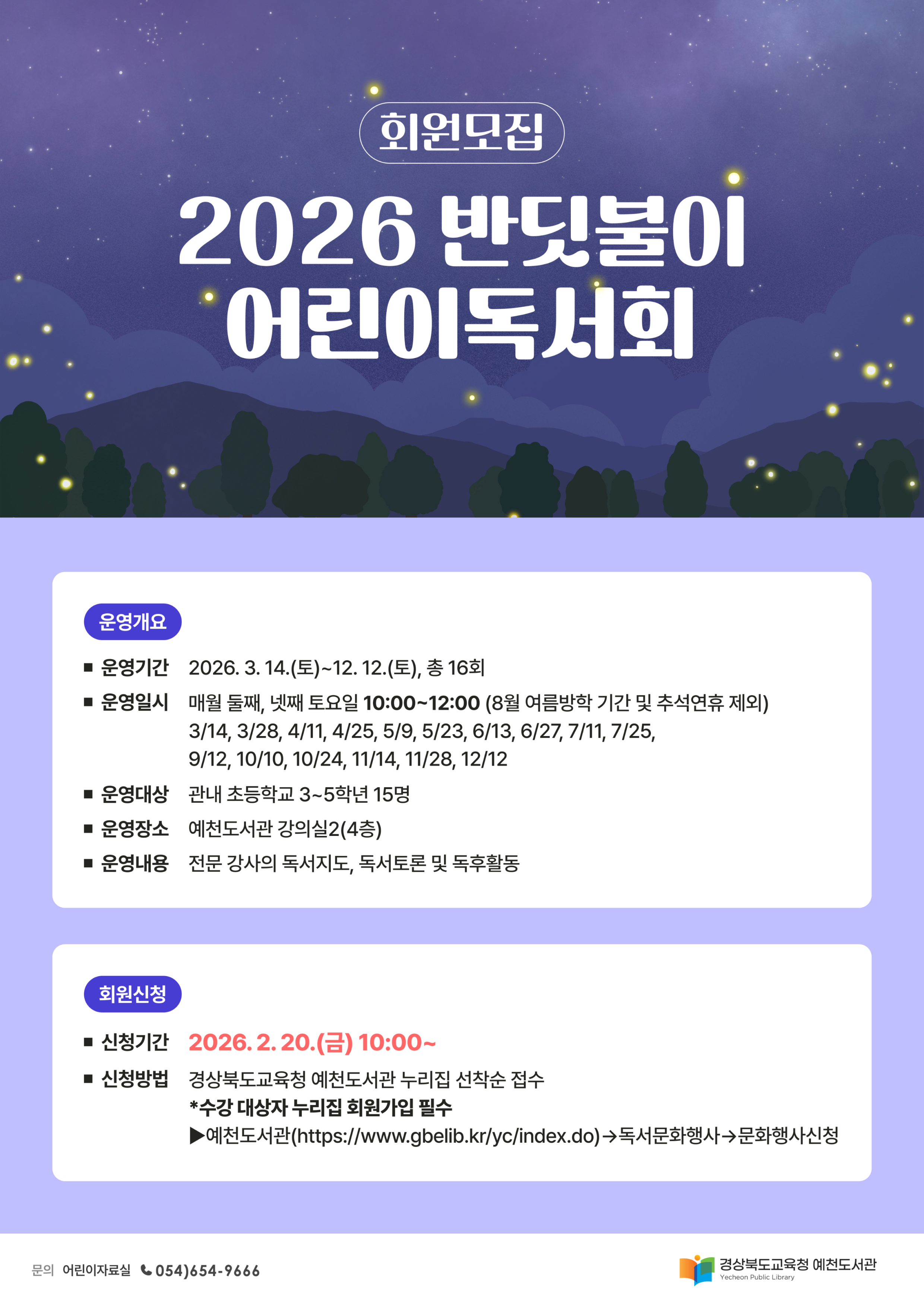 경상북도교육청 예천도서관(관장 김미연)은 이달 2월 20일부터 예천군 관내 초등학교 3~5학년을 대상으로 2026년 반딧불이 독서회원을 모집한다.