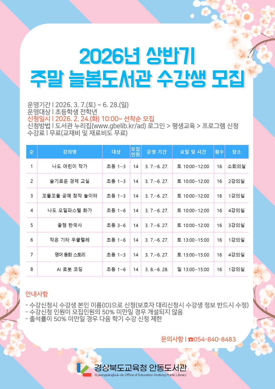 □ 경상북도교육청 안동도서관(관장 반선자)은 2026 도서관 연계 초등 돌봄·교육 프로그램 「늘봄도서관」 공모 사업으로 학부모들의 수요를 반영한 2026년 상반기 주말 늘봄도서관을 3월 7일부터 6월 28일까지 운영한다.