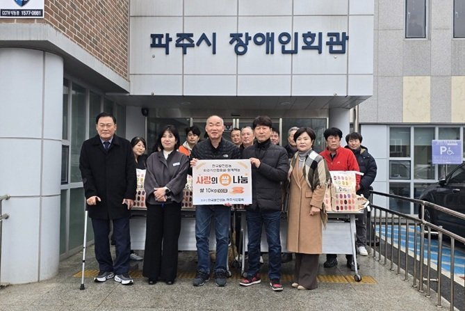 [금요저널] 파주시는 한국쌀전업농 파주시연합회가 지난 10일, 파주시 장애인회관에서 설 명절을 맞아 장애인을 위한 쌀 기부 행사를 개최했다고 밝혔다.
