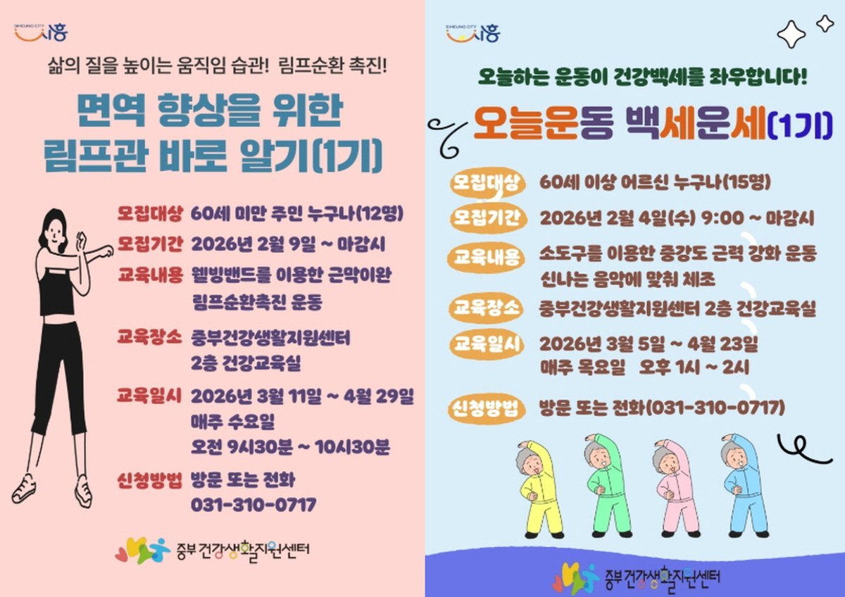 [금요저널] 시흥시보건소 중부건강생활지원센터에서는 일상 속 움직임이 쌓여 내일의 건강한 삶으로 이어질 수 있도록, 지역주민 대상 신체활동 프로그램 ‘오늘 운동 백세 운세’와 ‘면역 향상을 위한 림프관 바로 알기’를 운영한다.