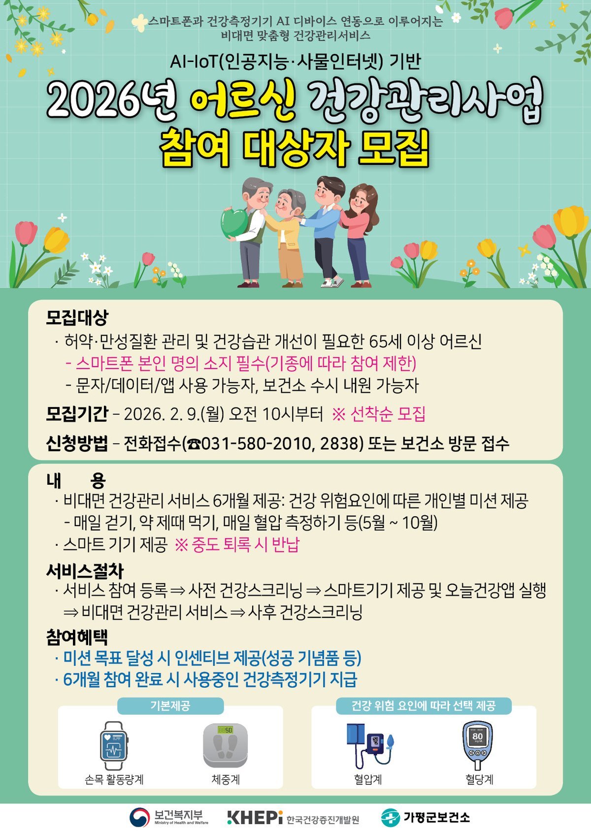 [금요저널] 가평군보건소가 개인 스마트폰을 활용하는 비대면 건강관리 프로그램인 'AI·IoT 기반 어르신 건강관리사업'을 올해 신규로 추진한다.