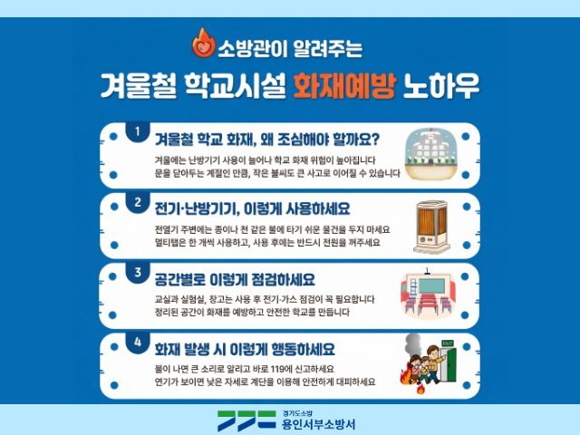 [금요저널] 용인서부소방서는 학교시설 겨울방학 기간과 겨울철 난방기기 사용 증가에 따라 안전한 교육환경 조성을 위해 관내 학교시설을 대상으로 학교시설 화재 집중 예방 기간을 2월 말까지 추진한다고 밝혔다.