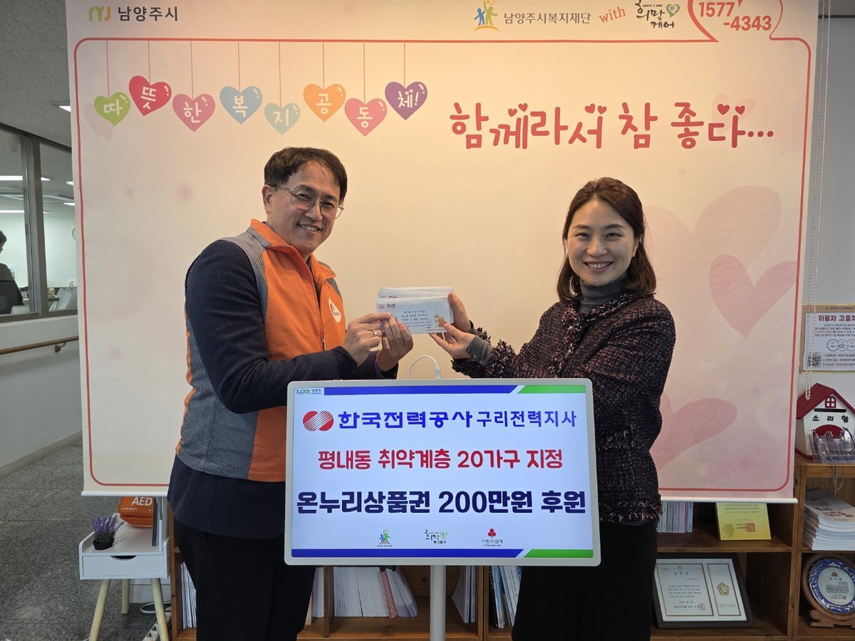 [금요저널] 남양주시는 지난 9일 한국전력공사 구리전력지사가 설 명절을 맞아 평내동 취약계층 지원을 위해 온누리상품권 200만원을 동부희망케어에 전달했다고 밝혔다.