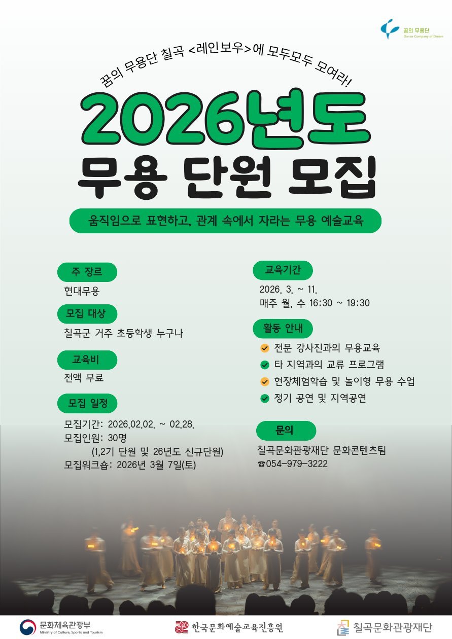 [금요저널] 칠곡문화관광재단은 2025 꿈의 무용단, '칠곡''레인보우'단원을 모집한다.