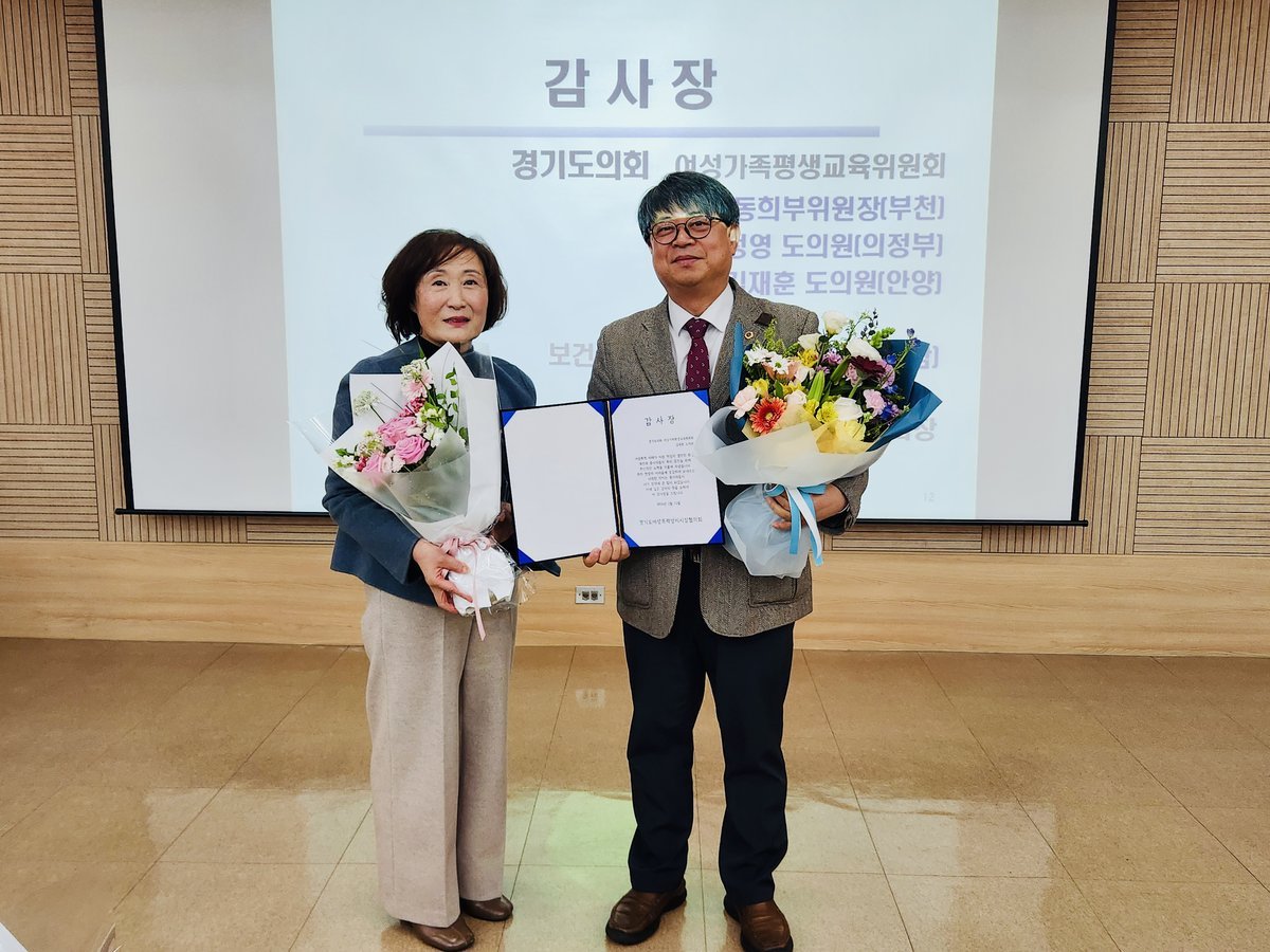 [금요저널] 경기도의회 여성가족평생교육위원회 김재훈 의원은 2월 11일 경기도여성폭력방지시설협의회로부터 여성폭력 피해자 지원 현장의 환경 개선과 종사자 복지 증진에 기여한 공로로 감사장을 받았다.