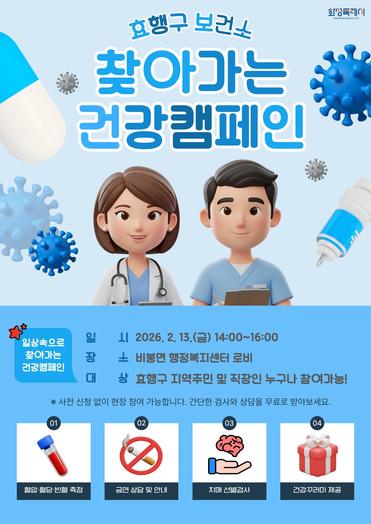 [금요저널] 화성특례시 효행구보건소는 지역 주민의 건강관리 능력 향상과 만성질환 예방을 위해 오는 13일 오후 2시부터 4시까지 비봉면 행정복지센터에서 방문 주민을 대상으로 '찾아가는 건강 캠페인'을 운영한다고 밝혔다.