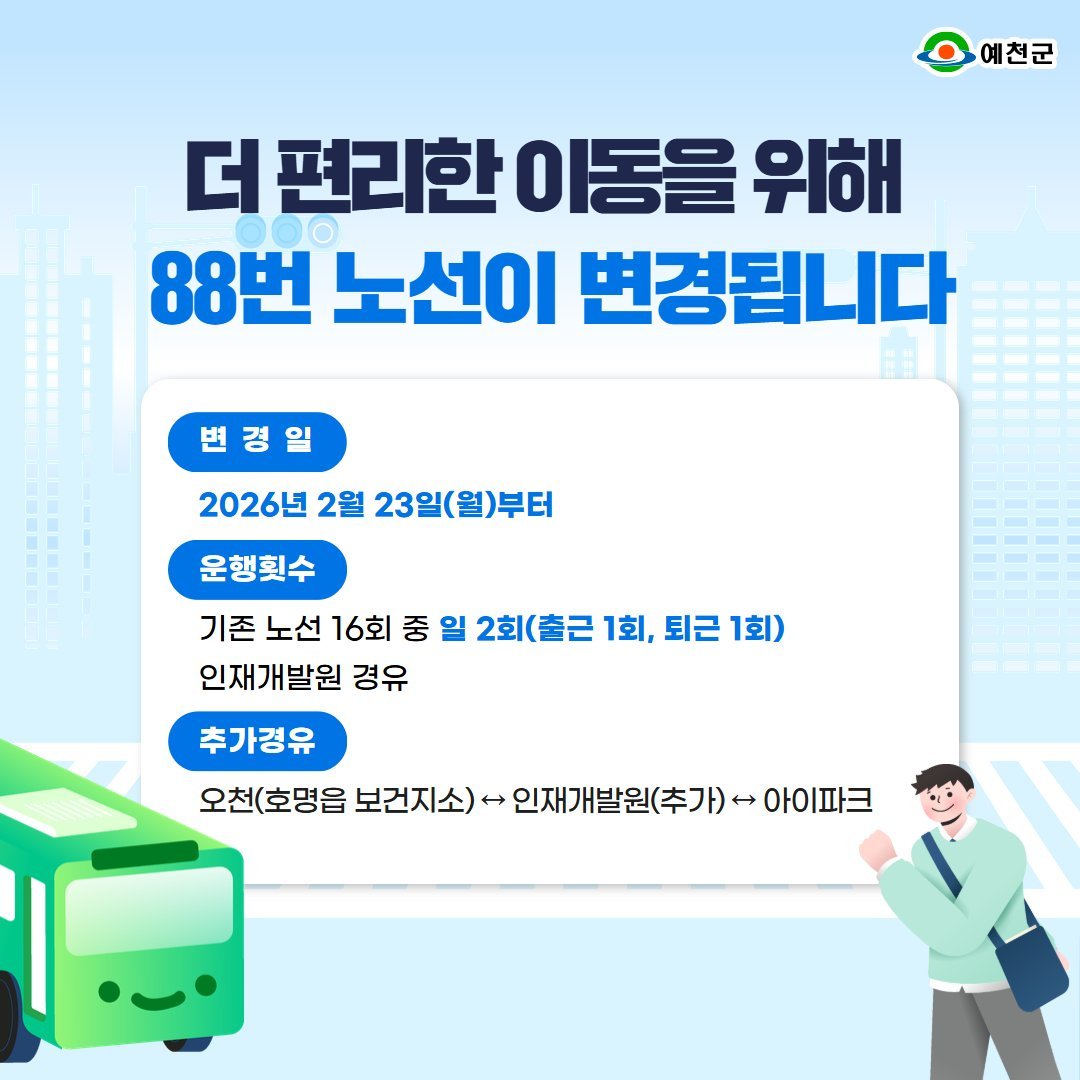 이번 노선 개편으로 88번 버스는 기존 오천리와 아이파크 사이 구간에 '인재개발원'이 추가된다.