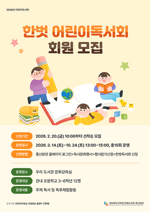 □ 회원 모집은 2월 20일(금) 오전 10시부터 도서관 홈페이지를 통해 가능하며, 자세한 내용은 풍산분관 홈페이지 안내 또는 전화(☎054-859-7590) 문의하면 된다.
