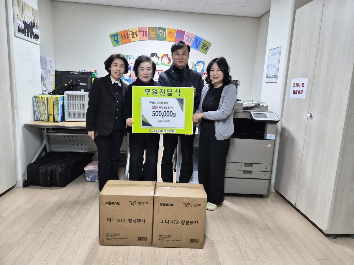 [금요저널] 한국철도공사 대구본부 경주역 새천년봉사회는 2026년 2월 12일 경주용강지역아동센터을 찾아 설맞이 사랑나눔 후원금과 미니 KT-청룡열차 20개를 전달했다.
