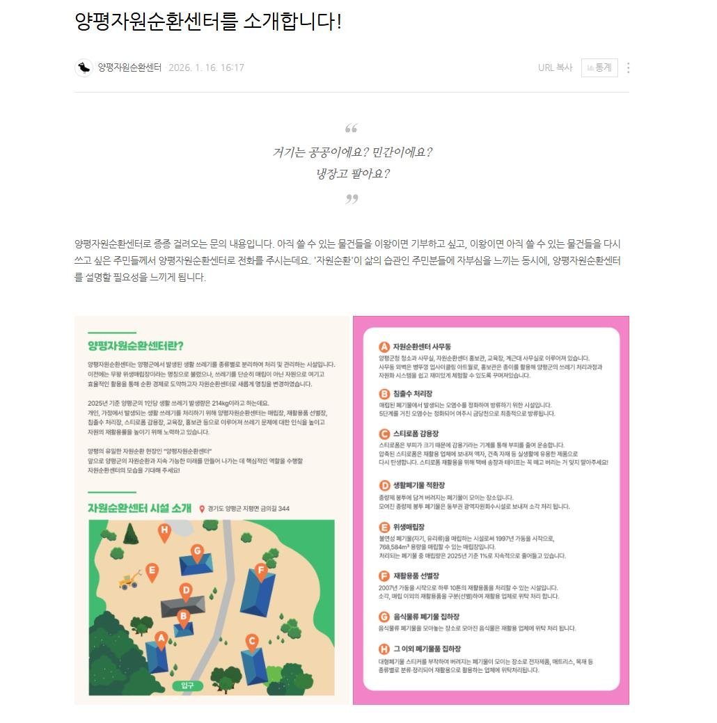 [금요저널] 양평군은 지난 12일 군민과의 소통을 강화하고 자원순환 정보 전달을 확대하기 위해 ‘양평자원순환센터 공식 블로그’를 개설·운영한다고 밝혔다.