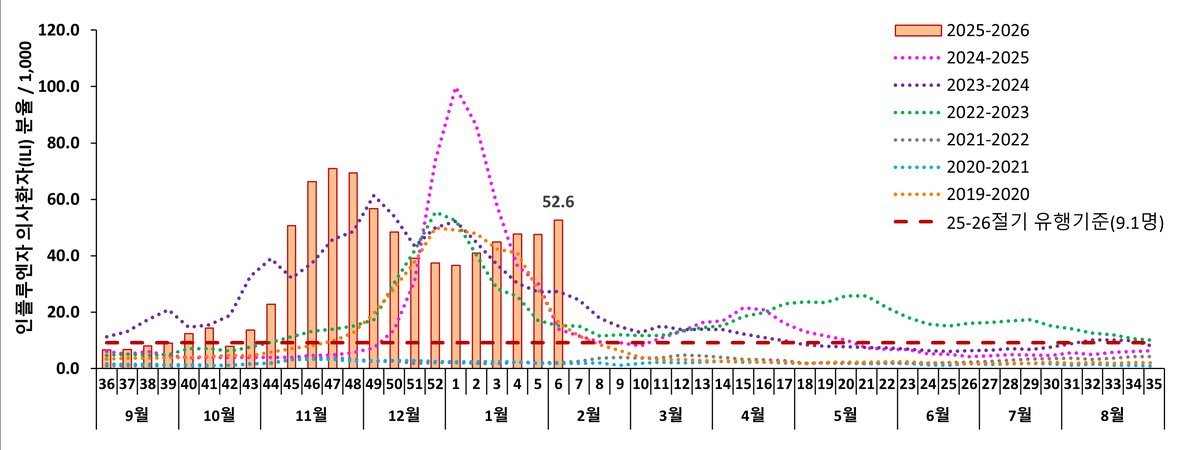 질병관리청에서 운영 중인 의원급 의료기관 표본감시 결과에서, 인플루엔자 의사환자* 분율**은 ’26년 6주차에 외래환자 1,000명당 52.6명으로 전주 대비 증가하였으며, 이번 절기 유행기준보다 높은 수준의 유행이 지속되고 있다.