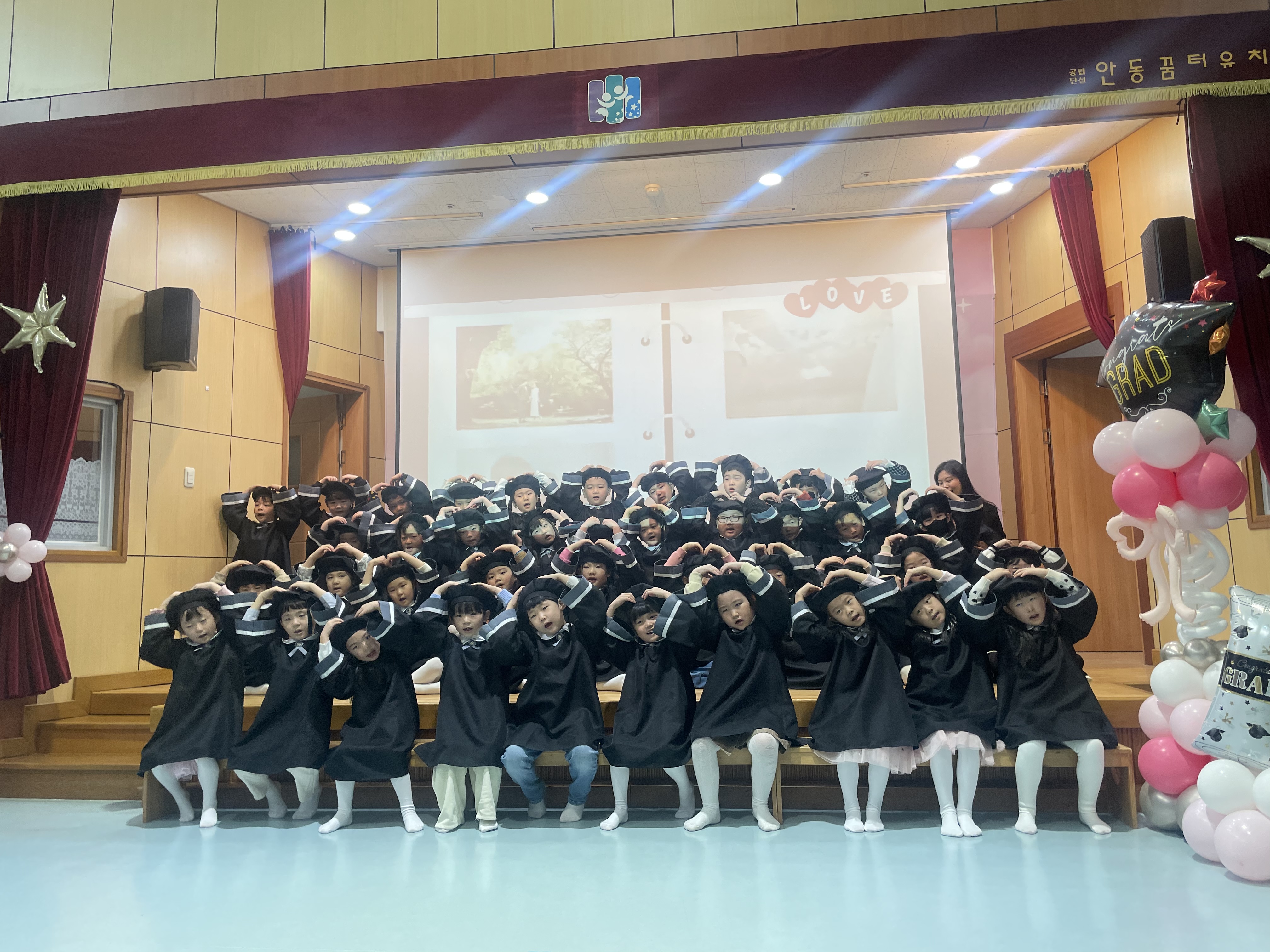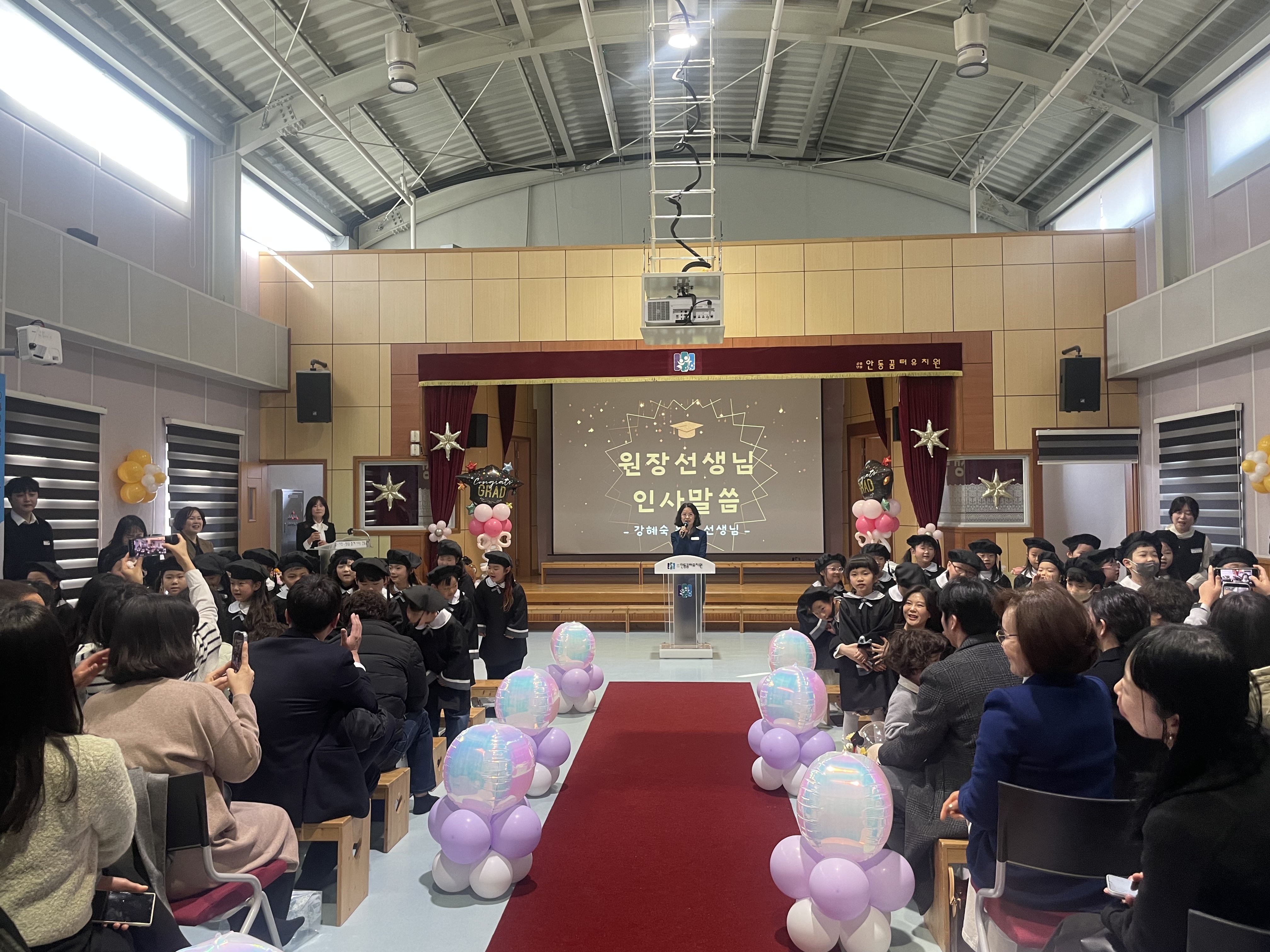 □ 이번 졸업식은 졸업생들이 보호자들과 선생님들의 환영 속에서 레드카펫을 통해 입장하는 것을 시작으로 재원생들이 준비한 축하 공연, 졸업장 수여, 졸업생 감사 공연, 원장 선생님 인사 말씀 순서로 진행되었으며 졸업생이 졸업가와 원가를 부르는 것으로 마무리 되었다.