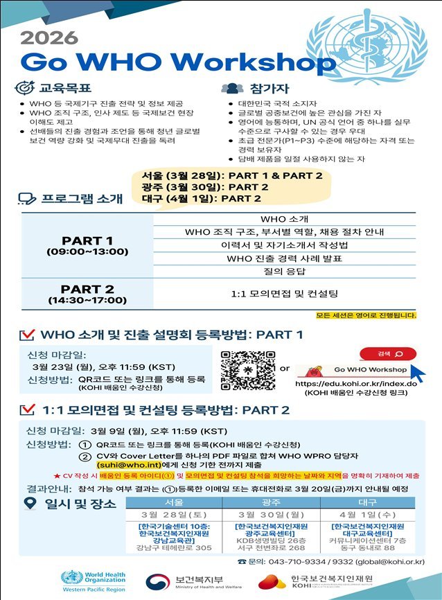 워크숍은 WHO 진출에 관심이 있는 대한민국 국민이라면 누구나 지원할 수 있다. 참가 신청은 2026년 3월 23일까지 포스터에 게재된 방법을 통해 온라인으로 신청할 수 있다.