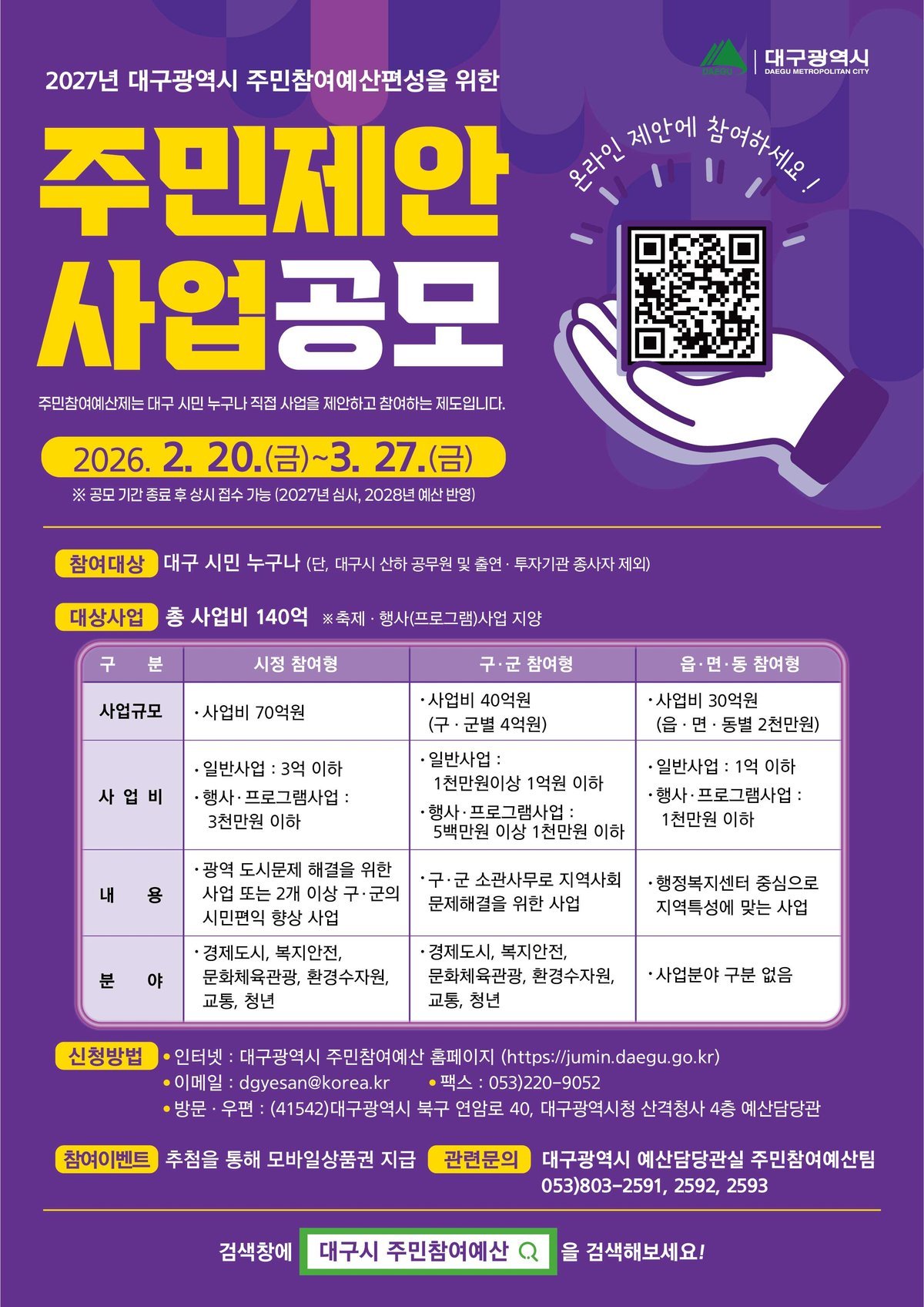 [금요저널] 대구광역시는 시민의 목소리를 시정에 직접 반영하기 위해 2월 20일부터 3월 27일까지 36일간 ‘2027년도 예산편성을 위한 주민제안사업’을 공모한다.