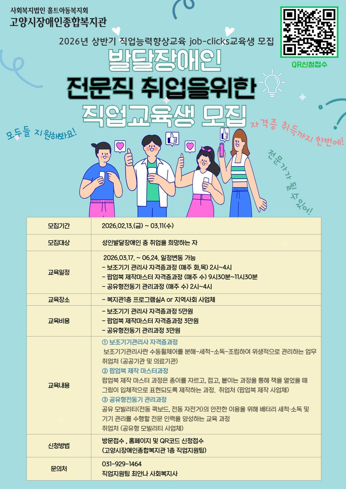 교육 신청은 3월 11일까지 복지관 1층 직업지원팀 방문 접수 또는 복지관 누리집및 QR코드를 통한 온라인 접수로 가능하다.