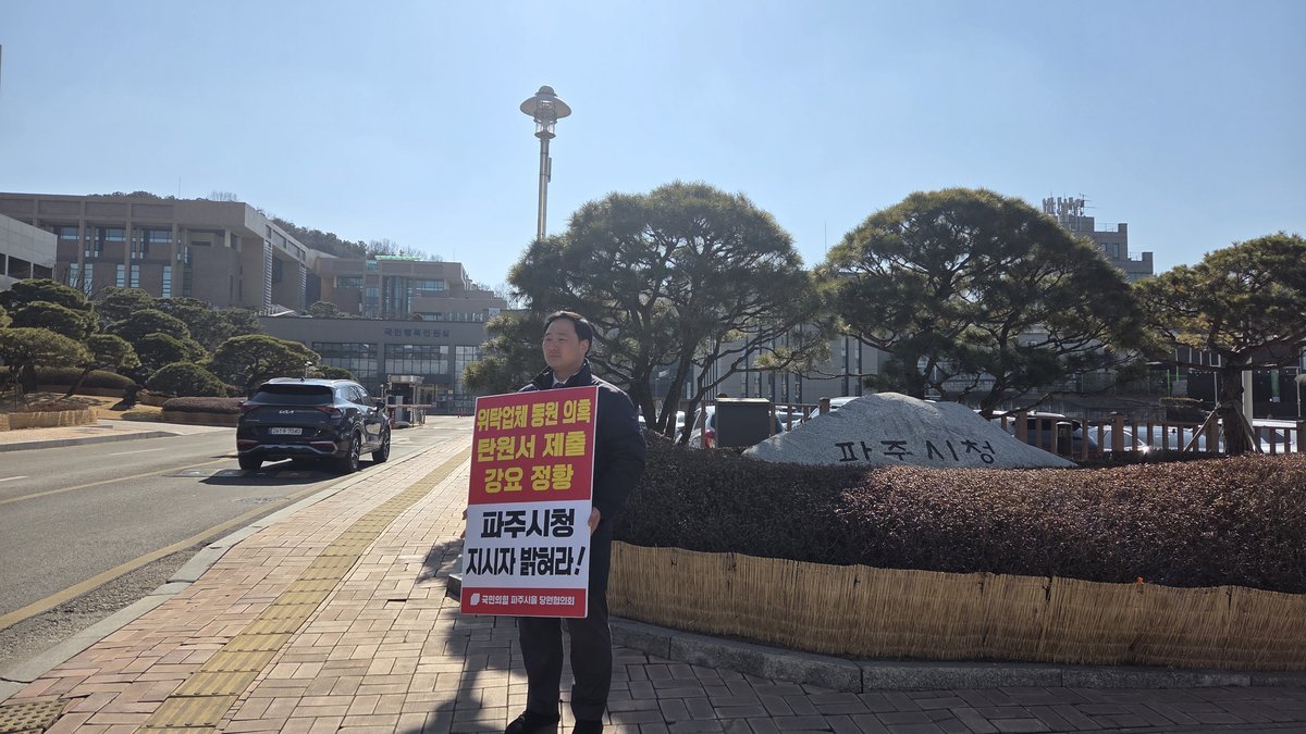 파주시 공무원 고발 사건 반부패수사대 이관 고준호 도의원 파주시청 앞 1인 시위 1 경기도의회 제공