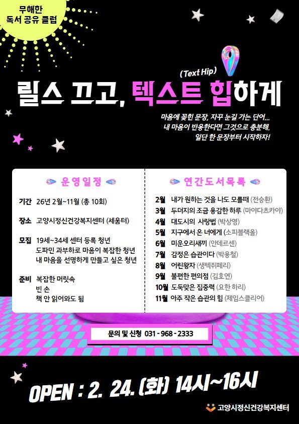 [금요저널] 고양시정신건강복지센터는 만19~34세 등록청년을 대상으로 ‘무해한 독서 공유 클럽’을 매달 운영한다.