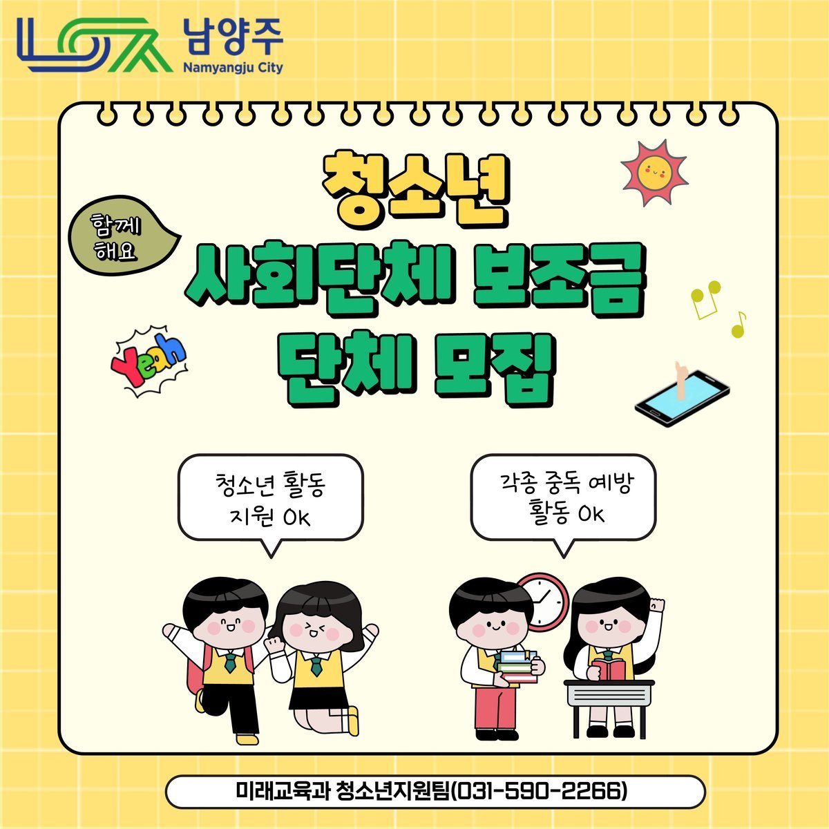[금요저널] 남양주시는 2월 20일부터 3월 6일까지 청소년의 권리 증진과 다양한 활동 지원을 위해 ‘청소년 사회단체 보조금 공모사업’을 신청받는다.