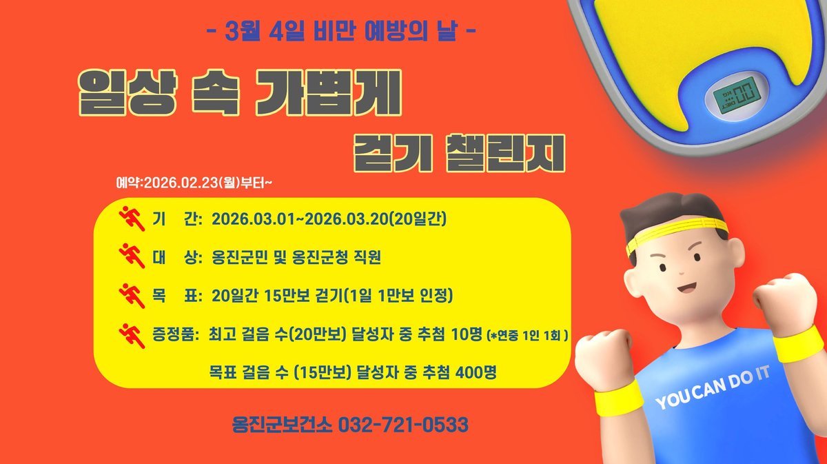 [금요저널] 옹진군은 군민의 일상 속 걷기 실천을 유도하고 비만 예방과 건강생활 실천 분위기 조성을 위해 3월 1일부터 20일까지 운영되는 '일상 속 가볍게 걷기'챌린지 참가자를 23일부터 모집한다고 밝혔다.