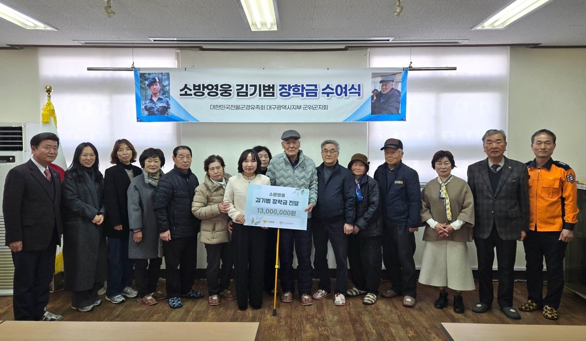 [금요저널] 전몰군경유족회 군위군지회는 지난 20일 소방영웅 고김기범 소방교의 숭고한 희생정신을 기리고 전몰군경유족회 손자녀 8명을 격려하기 위한 '김기범 장학금 수여식'을 개최했다.