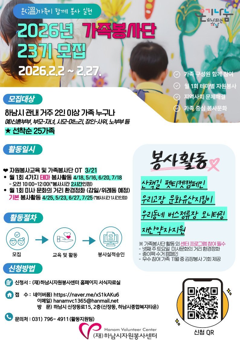 [금요저널] 하남시자원봉사센터는 가족이 함께 참여하는 자원봉사 프로그램인'제23기 하남시자원봉사센터 가족봉사단'참여 가족을 선착순 25가족 모집한다.
