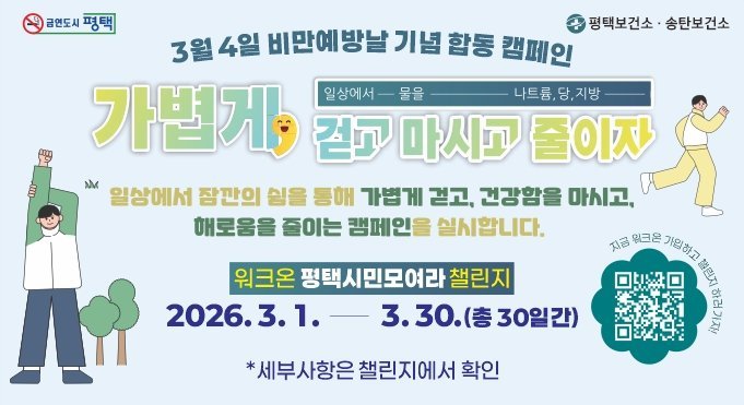 [금요저널] 평택시는 오는 3월 4일 ‘비만 예방의 날’을 맞아, 3월 한 달간 시민과 함께하는 ‘가볍게 걷고 마시고 줄이자’합동 캠페인을 대대적으로 전개한다고 밝혔다.