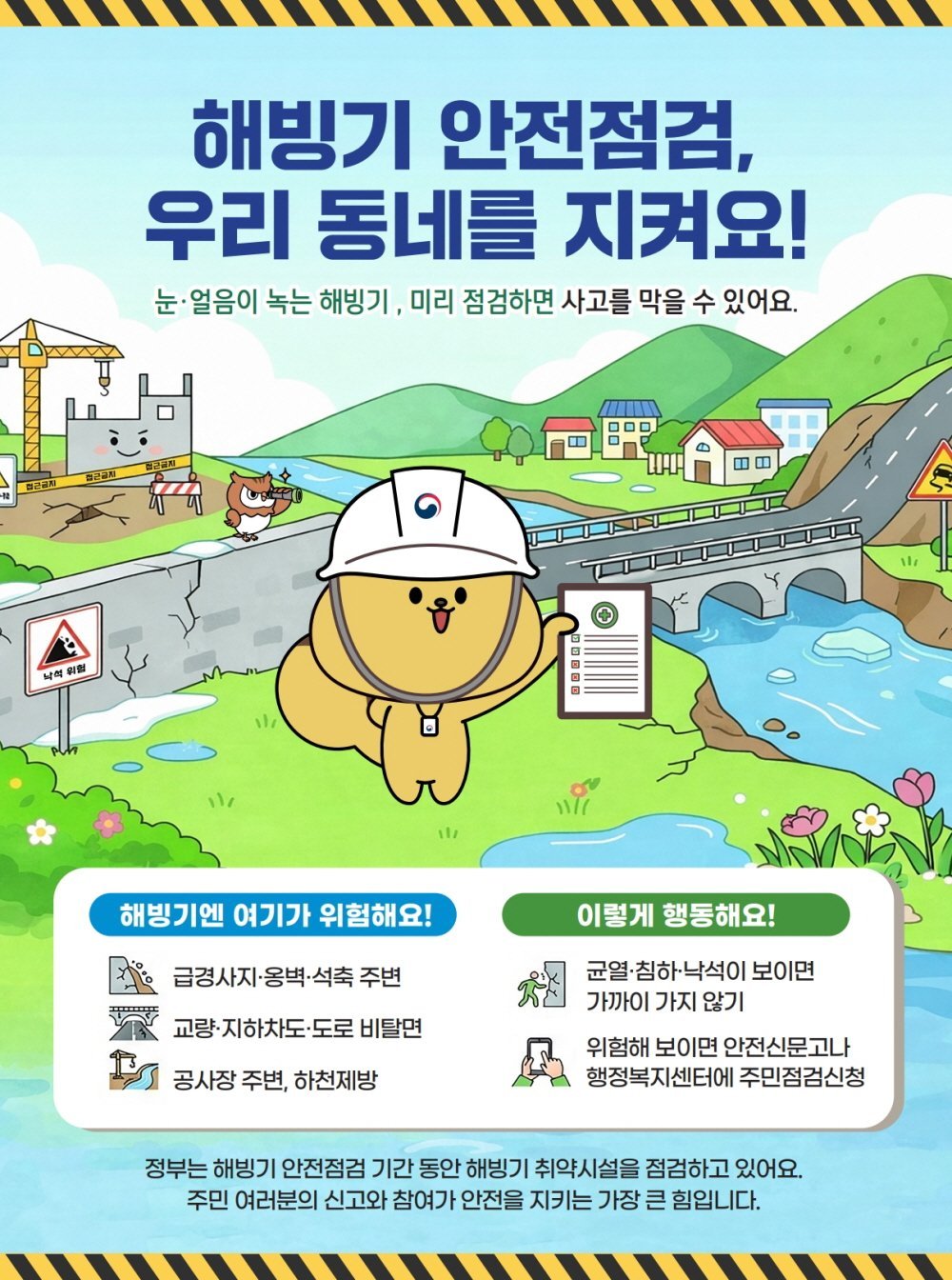 점검 대상은 급경사지, 건설공사장, 배수지 등 사고 발생 우려가 큰 시설 119곳으로, △비탈면 균열 △시설물 주변 지반 침하 여부 △구조물 변형 여부 등 해빙기 특성에 따른 위험요인을 중점적으로 확인할 예정이다.