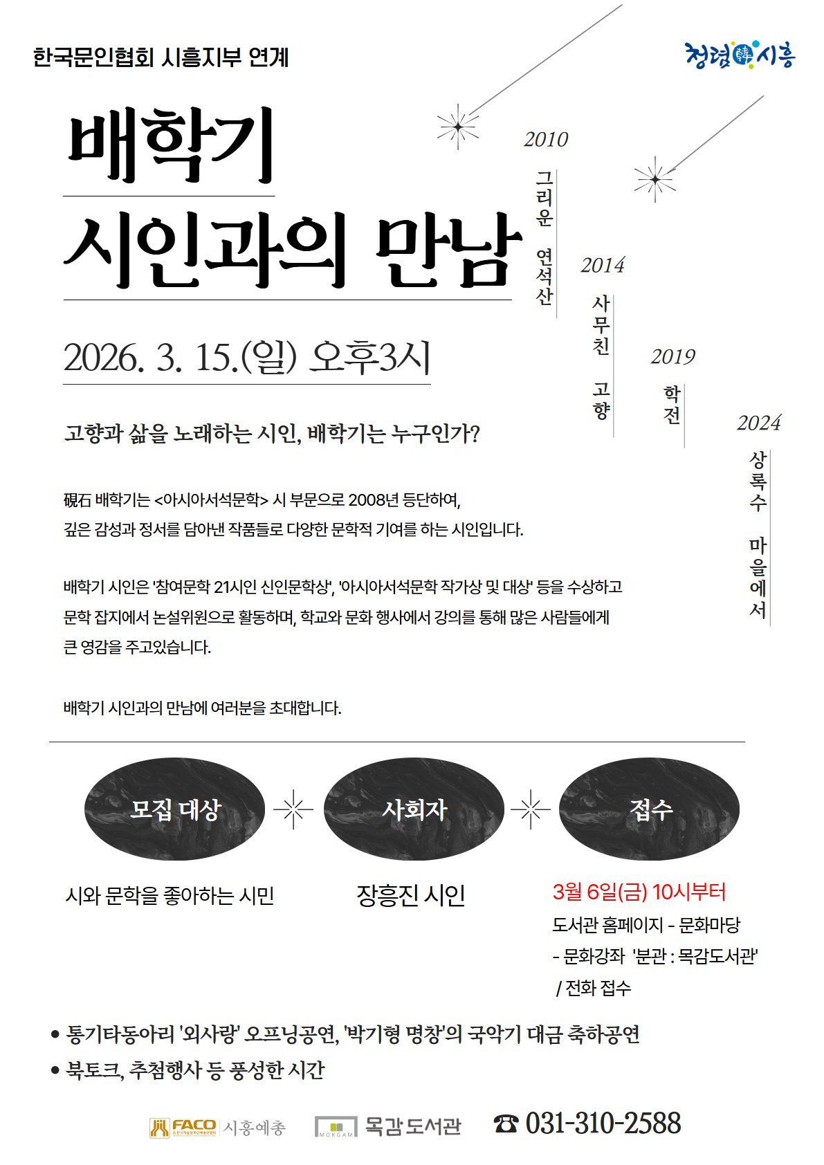 이번 만남은 3월 15일 오후 3시, 목감도서관 지하 1층 다목적실에서 진행되며, 시와 문학에 관심이 있는 50여 명의 시민과 함께한다. 시인이 직접 자신의 작품을 낭독하고, 시를 쓰게 된 계기와 창작 과정에 관한 이야기를 들려줄 예정이다. 또한, 시민들과 자유롭게 질문을 나누며 시와 삶에 대해 편안하게 대화하는 시간도 마련된다.