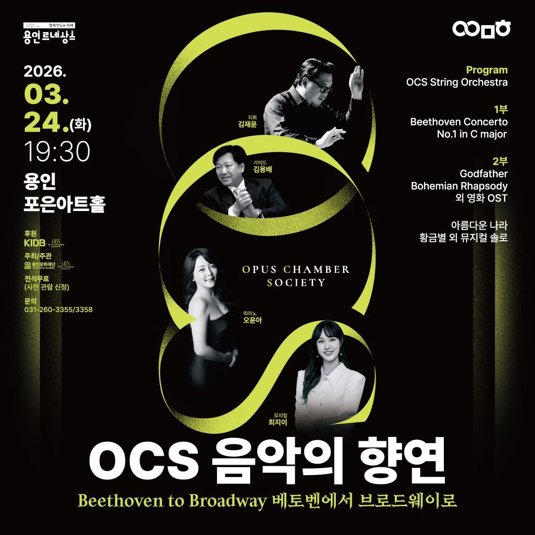 [금요저널] 용인문화재단은 오는 3월 24일 용인포은아트홀에서 오퍼스 체임버 소사이어티와 공동으로 'OCS 음악의 향연, Beethoven to Broadway'공연을 개최한다.