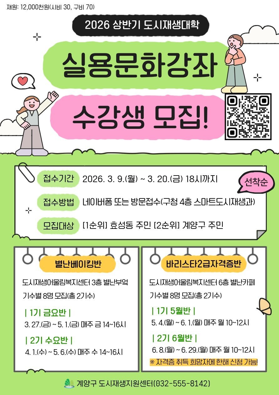 [금요저널] 인천광역시 계양구는 오는 3월 9일부터 20일까지 ‘2026년 상반기 도시재생대학 실용·문화강좌’수강생을 선착순 모집한다고 밝혔다.
