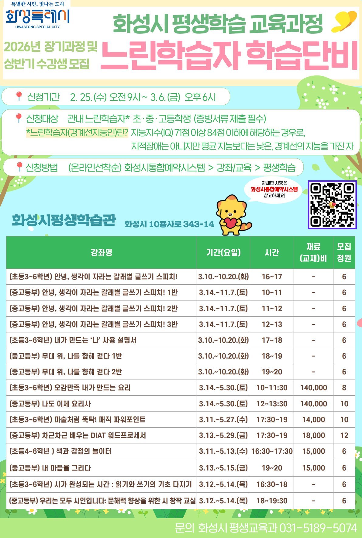 각 강좌의 운영 일정, 강사, 정원 등 세부 사항은 화성시통합예약시스템을 통해 확인할 수 있으며 선착순으로 접수한다.