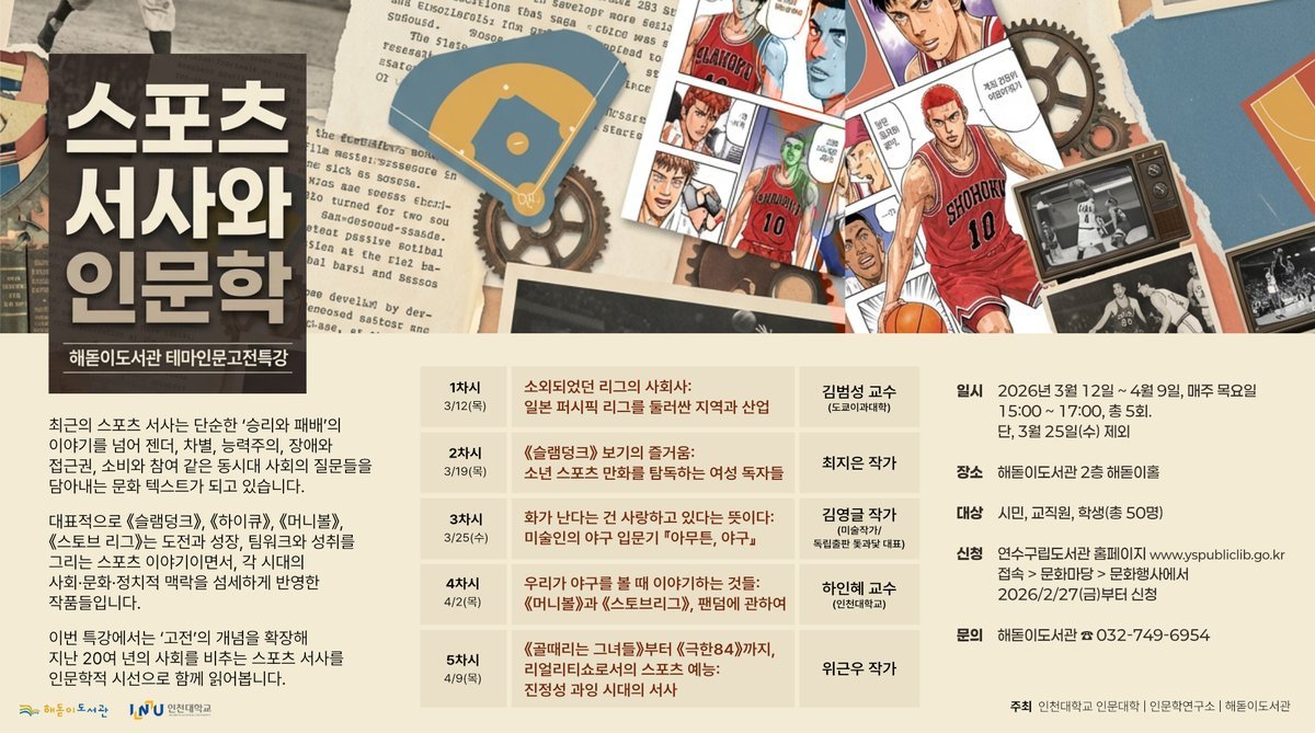 스포츠 서사에 관심이 있는 성인은 누구나 참여할 수 있으며 신청은 27일 오후 2시부터 연수구립도서관 누리집에서 선착순으로 할 수 있다.