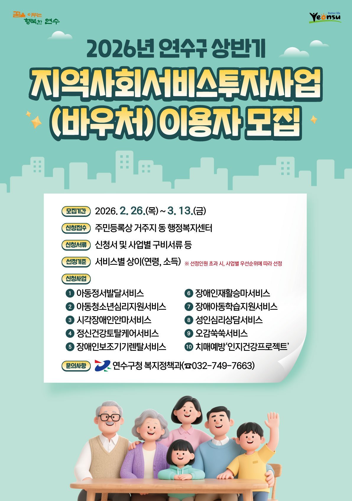 자세한 사항은 연수구청 누리집 내 공지 사항에서 확인하거나, 연수구 복지정책과 및 동 행정복지센터로 문의하면 된다.